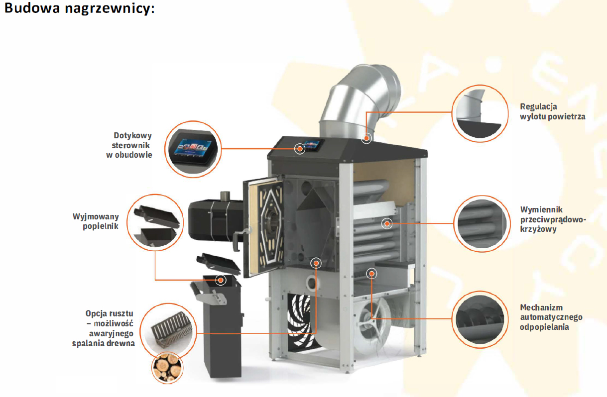 Gorące spaliny powstałe podczas spalania peletu przechodzą do komina poprzez krzyżowy wymiennik trzyciągowy, a wentylator nadmuchowy schładza wymiennik przekazując ciepło na halę.