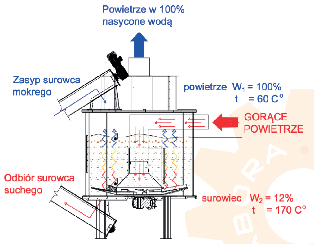 Gorące powietrze przepływa przez złoże suszonego materiału w układzie przeciwprądowym, co umożliwia usunięcie oparów o wilgotności bliskiej 100%.